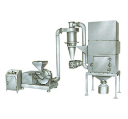 该机有粉碎主机、旋风分离器、脉冲除尘箱等部分组成。物料由加料斗进入粉碎室,通过高速旋转的锤片进行粉碎,粉碎细度可调节分级刀与分级盘的距离来达到所需要的细度,粉碎好的物料经转离心力和引风机的作用进入旋风分离器,然后,通过关风机出料,粉尘进入脉冲除尘箱,经过过滤筒过滤后回收利用。该机按“GMP”标准设计,整机全部用不锈钢材料制造,粉碎过程中无粉尘飞扬。